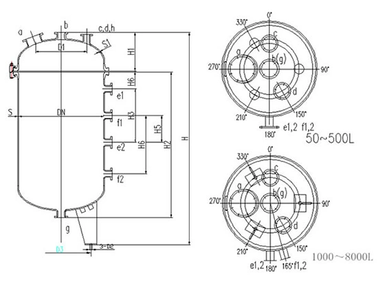 | Ном. объем (Vном/л) | DN | D1 | D2 | D3 | H | H1 | H2 | H3 | H4 | S | H5 | H6 |