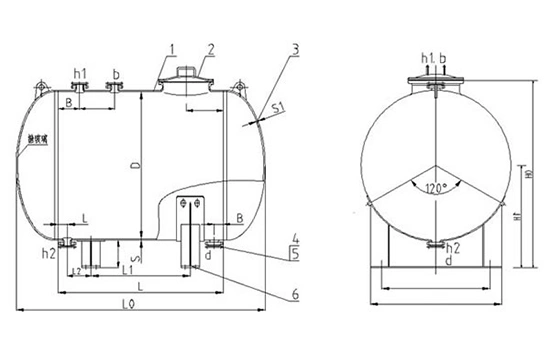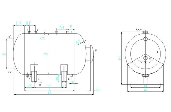 | Ном. объем (Vном/л) | Факт. объем (Vфакт/л) | Диаметр (D) | Резервуар | Толщина днища S1 | Ном. диаметр штуцеров (Dном) | L0 | L | L1 | L2 | H0 | H1 |
